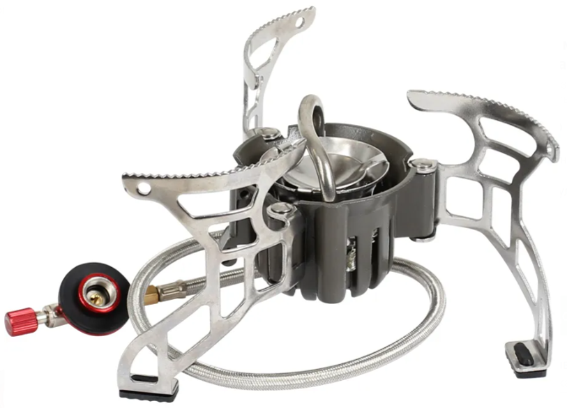 Узел крепления баллона отделен от горелки 40сантиметровым топливопроводным шлангом, благодаря чему она устойчива и баллон при необходимости можно подогревать (очень осторожно), не прерывая процесса приготовления пищи.